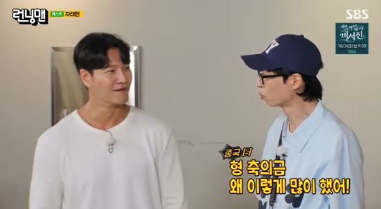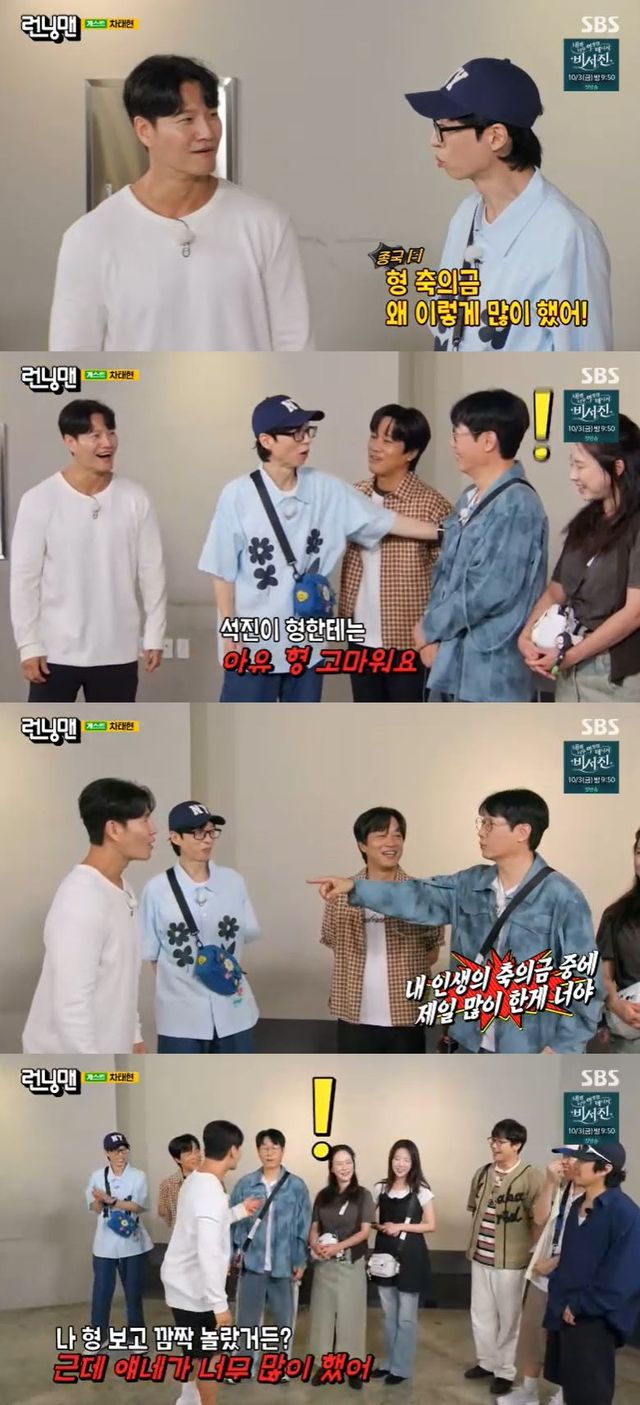 지석진은 김종국에게 "내 인생의 축의금 중에 제일 많이 한 게 너다"라며 억울함을 표했다. 그러자 김종국은 "나 형 보고 깜짝 놀랐다. 그런데 양세찬과 최다니엘이 너무 많이 했다"고 털어놔 놀라움을 자아냈다.