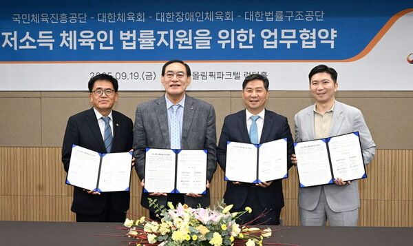 뉴시스 보도에 따르면, 4개 기관은 지난 19일 서울 송파구 올림픽파크텔에서 저소득 체육인 대상 법률지원을 위한 업무협약을 체결했다.