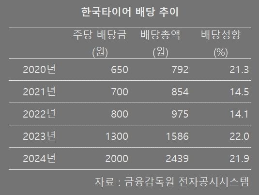 2020년 650원이던 한국타이어의 주당 배당금은 2021년 700원, 2022년 800원, 2023년 1300원, 2024년 2000원 등으로 매년 증가하고 있다. 배당총액도 2020년 792억, 2021년 854억, 2022년 975억, 2023년 1586억, 2024년 2439억원 등 매년 증가추세다. 다만, 배당성향은 2024년 21.9%로, 2020년(21.3%)과 큰 차이가 없다.