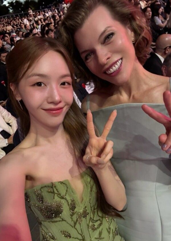 방민아는 지난 19일 자신의 인스타그램에 “밀라 요보비치에게 팬이라고 사진 요청, 그분도 나를 찍어가심”이라는 글과 함께 부산국제영화제에서 찍은 사진을 여러 장 공개했다. 사진 속 방민아는 초록색 드레스를 입고 우아한 자태를 뽐내며 밀라 요보비치와 나란히 서서 밝게 웃고 있다.