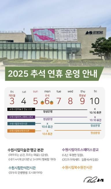 수원시립미술관 행궁 본관은 개천절인 10월 3일(금)부터 추석 연휴와 한글날인 10월 9일(목)까지 휴관 없이 정상 개관하며 추석 당일인 10월 6일(수)에는 무료 관람을 실시하며, 10월 10일(금)에 대체 휴관한다.