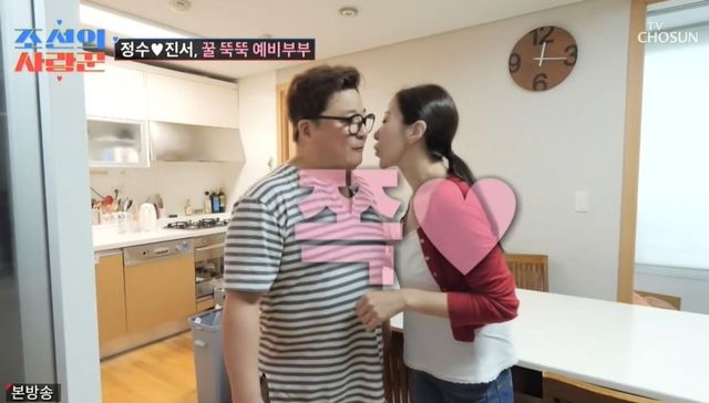 윤정수는 평소에도 뽀뽀를 자주 한다고 말하며 “내가 이 사람한테 사랑받는단 안정감을 느끼게 해준다”라며 “하루에 50번은 넘게 하는 것 같다”라고 밝혔다. 원진서는 “주말엔 그렇고, 평일엔 10번~20번 한다. 일하러 가니까”라고 진지하게 답하기도.