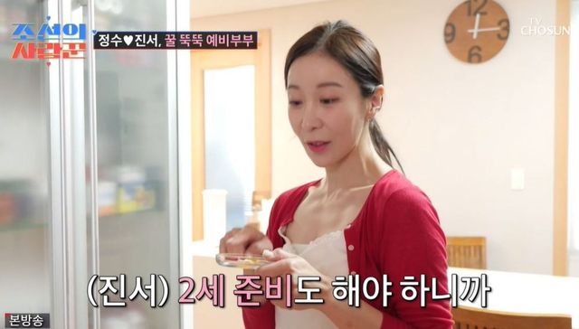 원진서는 윤정수의 영양제를 챙겼고, “2세 준비해야 하니까”라고 밝혔다. 영양제를 먹은 후에도 두 사람은 뽀뽀했고, 최성국은 “너무 하잖아요”라고 불만을 토로했다. 윤정수는 “부럽죠?”라며 자랑하기도.