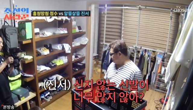 또한 원진서는 “집도 좀 정리해야 하지 않냐”라고 말했다. 인터뷰에서 원진서는 “오빠가 돈을 버는 만큼 많이 쓰는 것 같더라. 애착이 많아서 버리질 못한다. 비울 거만 비우면 집이 깔끔해지지 않을까”라고 밝혔다. 쌓여있는 신발만 약 50켤레인 상황. 원진서는 “신는 걸 못 봤는데”라고 지적했다.