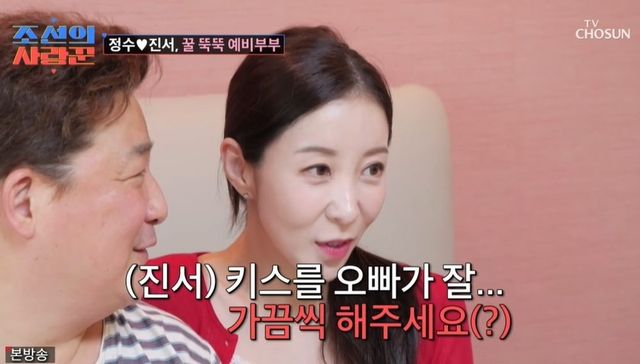 한 번에 뽀뽀를 여러 번 할 때도 있단 말에 제작진이 “차라리 키스하지”라고 하자 원진서는 “오빠가 키스를 가끔 해주세요”라고 솔직히 말했다. 원진서가 “처음엔 잘해줬는데”라고 하자 당황한 윤정수는 “키스하면 자꾸 다음 단계로 가려고 해서 부담스럽다”라고 고백했다. 원진서가 뒤에서 찌르자 윤정수는 “농담이다”라고 말하기도.