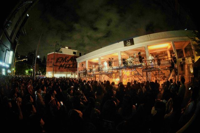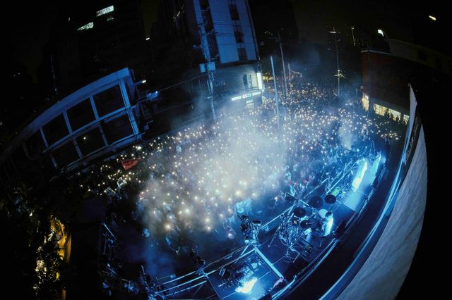 쎈느 앞에 세워진 야외 구조물이 무대로 변모했고, 멤버들이 그 위에서 연주를 시작하자 건물 전체가 하나의 연출 도구처럼 기능했다. 내부와 외벽을 수놓은 조명은 맞은편 건물까지 번져 거리를 통째로 물들였고, 깃발을 든 팬들, 성수 한복판에서 펼쳐진 슬램과 떼창이 더해지며 현장은 단숨에 록 페스티벌을 방불케 했다.