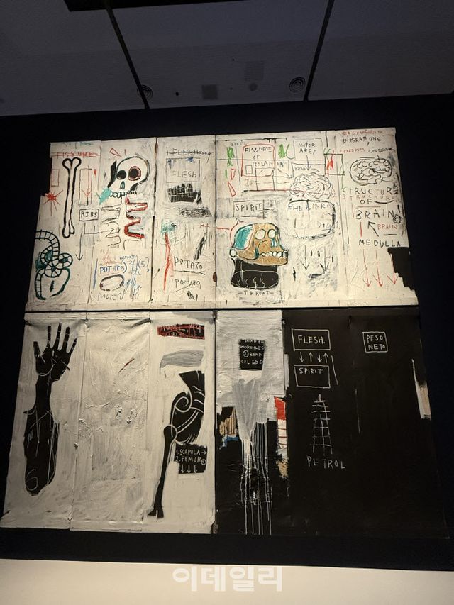 이번 전시를 공동 기획한 큐레이터 아나 카리나 호프바우어, 디터 부흐하르트는 바스키아가 1983년 완성한 대작 ‘육체와 영혼’(Flesh and Spirit, 1982~1983)을 이번 전시에서 빠트릴 수 없는 작품으로 꼽았다. 4개의 큰 화면과 12개의 패널로 이루어진 작품으로 제목처럼 ‘육체’와 ‘정신’을 중심으로 해부학적 도상과 아프리카의 영적 상징을 병치해 삶과 죽음, 과학과 신앙의 경계를 탐구한다.