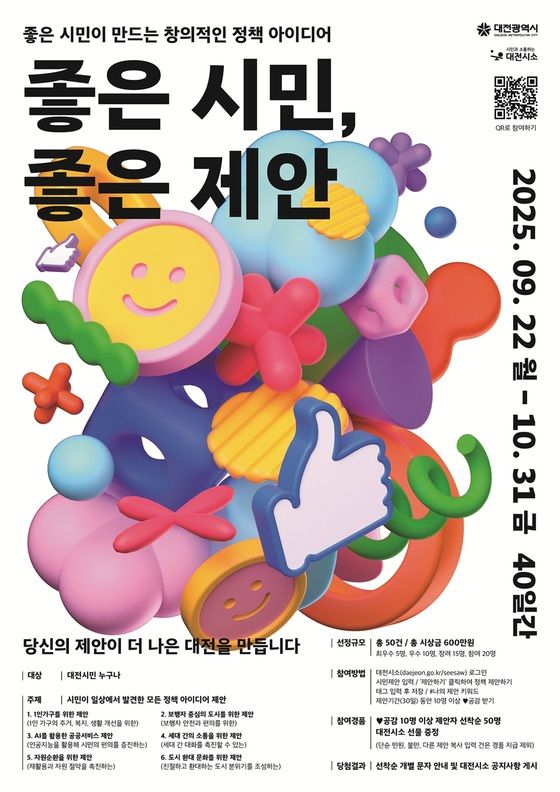 대전시는시민참여플랫폼‘대전시소’를통해9월22일부터10월31일까지40일간《좋은시민,좋은제안》공모를실시한다.이번공모는생활속에서발견한정책아이디어를시정에반영하기위한것으로,창의적이고실현가능한시민제안을접수한다.