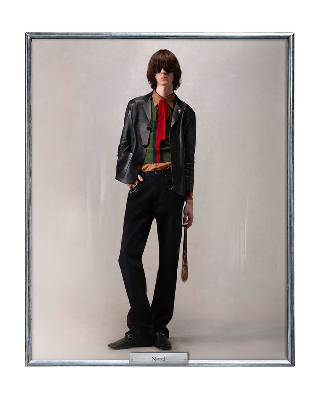 남성 룩 역시 단번에 시선을 사로잡았죠. 과감한 마초부터 젠더리스한 시스루 톱, 클래식한 테일러링이 돋보이는 수트까지, 뎀나는 다채로운 무드를 자유롭게 오가는 관능적인 구찌 맨을 상상했습니다. 반짝이는 글리터 룩으로 클럽 신의 역동적인 에너지를 그대로 옮겨오기도 했고요. 무엇보다도 초상화 아래 쓰인 적절한 이름들도 위트 넘치는 포인트입니다. 'La VIP', 'Nerd', 'Narcisista' 등 각 룩과 초상에 완벽히 들어맞는 명패를 보면 그 누구라도 실소를 금치 못할 테니까요. 가족이라는 틀 안에서 뎀나가