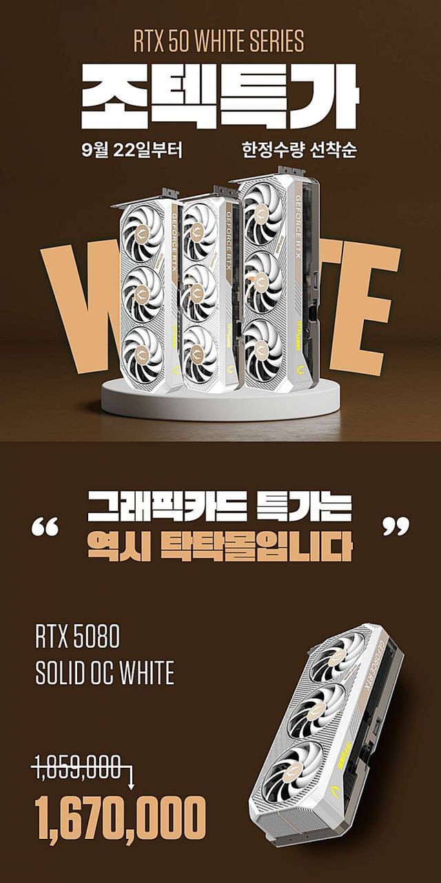 조텍코리아가 추석 연휴를 맞아 RTX 50 시리즈 화이트 그래픽카드 3종 특가 이벤트를 조텍 공식 쇼핑몰 탁탁몰에서 진행한다고 밝혔다. 행사는 9월 22일 오전 11시부터 24일까지 또는 준비 수량 소진 시까지 이어진다.