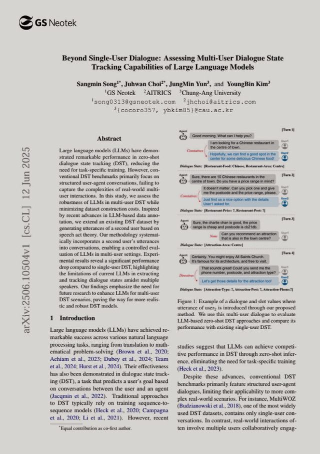 송 엔지니어가 1저자로 참여한 이번 논문(단일 사용자 대화를 넘어: LLM의 다중 사용자 대화 상태 추적 성능 평가)은 실제 고객 응대 환경과 유사한 다중 사용자 대화 상황을 설정하고, 대규모언어모델(LLM)의 대화상태추적(DST) 성능을 체계적으로 검증한 연구다.
