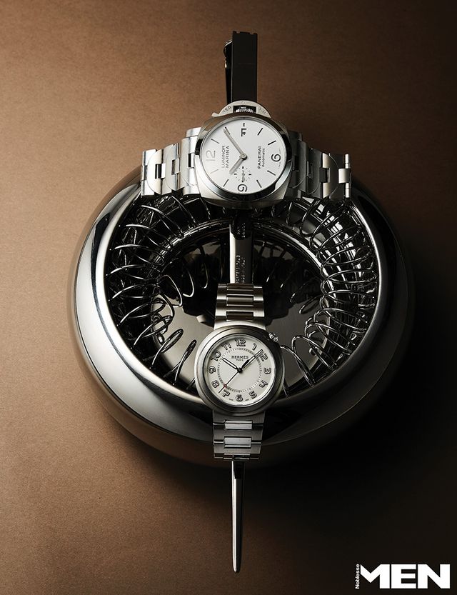 둥근 케이스 안 또 하나의 완벽한 원을 담아낸 에르메스 컷. 남녀 모두에게 잘 어울리는 지름 36mm 케이스에 오팔린 실버 다이얼을 장착했고, 1시 30분 방향에 배치한 크라운이 에르메스 특유의 위트를 드러낸다. Herme`s.