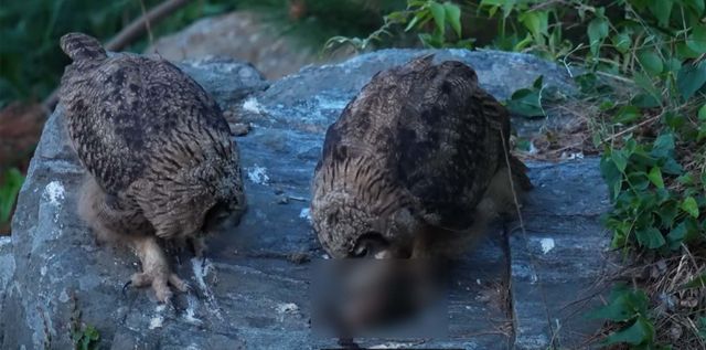 특히 어미 수리부엉이가 고양이를 깔끔하게 정리해 새끼들에게 제공하는 모습도 관찰됐다. 새끼 수리부엉이들은 차례대로 어미가 가져온 고양이를 뜯어먹으며 형제끼리 나눠 먹는 모습도 보였다.