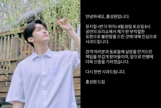 (엑스포츠뉴스 정민경 기자) 배우 홍성원이 뮤지컬 공연 중 발언에 대해 사과했다.