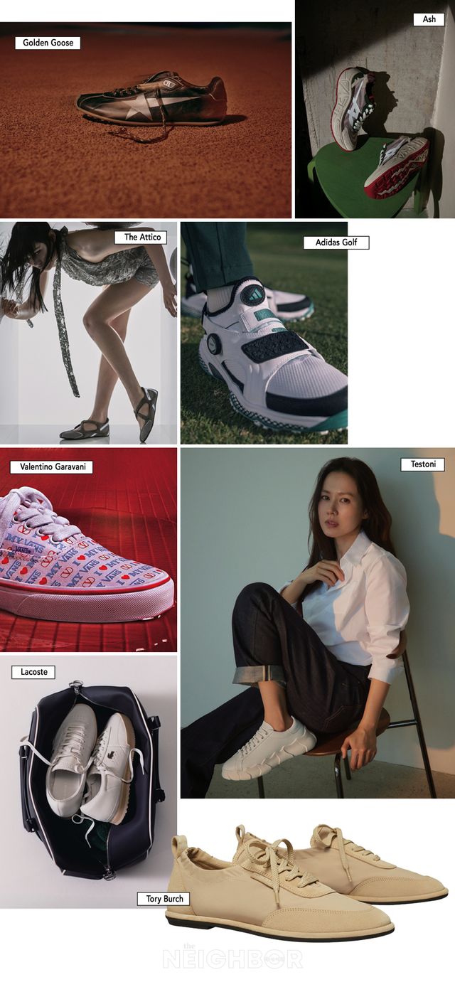 발레 슈즈의 슬림한 실루엣과 스니커즈의 편안함이 만난 ‘발레 스니커즈’. 스웨이드와 나일론 소재가 조화롭게 어우러진 스니커즈는 토리 네이비, 아미, 라이트 듄 세 가지 컬러로 구성된다.