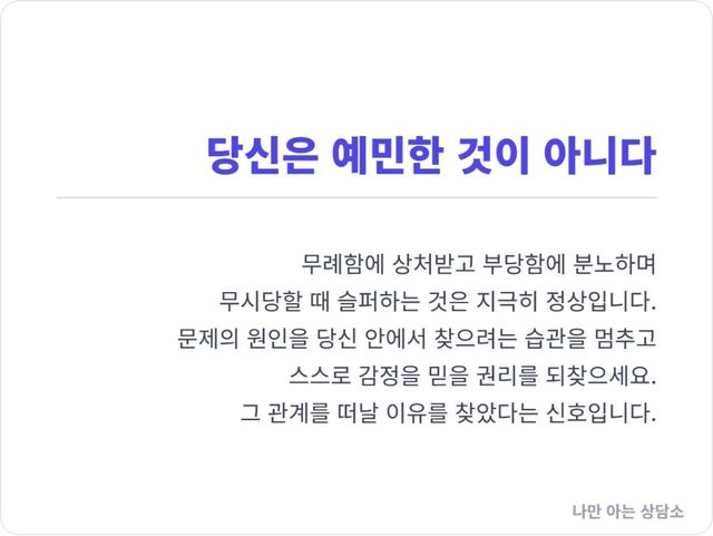 문제의 원인을 당신 안에서 찾으려는 그 오랜 습관을 멈춰라. 당신이 “너무 예민하다”는 말을 들었다면, 그것은 당신이 고쳐야 할 문제가 있다는 뜻이 아니라, 당신이 그 관계를 떠나야 할 이유를 찾았다는 뜻일 수 있다.