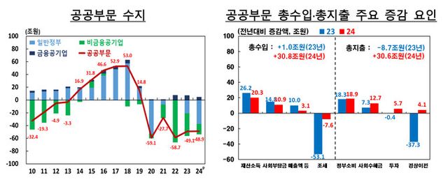 23일 한국은행이 발표한 '2024년 공공부문 계정(잠정)'에 따르면 지난해 공공부문 수지(총수입-총지출)은 48조9000억원 적자를 기록했다. 지난 2023년(49조1000억원)과 비슷한 적자 규모지만, 2020년 이후 5년 연속 마이너스다.