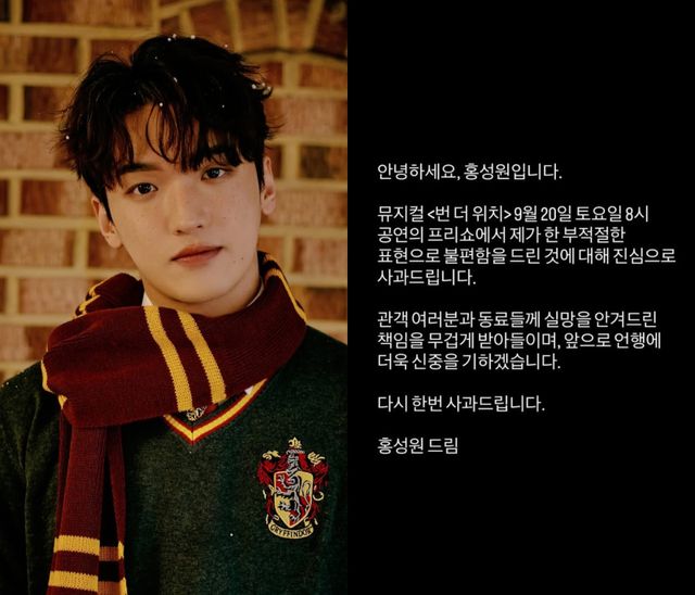 홍성원은 지난 22일 자신의 SNS에 “뮤지컬 ‘번 더 위치’ 프리쇼에서 부적절한 표현으로 불편함을 드려 진심으로 사과드린다”며 “관객과 동료들께 실망을 안겨 드린 책임을 무겁게 받아들이며, 앞으로 언행에 더욱 신중을 기하겠다”고 밝혔다.