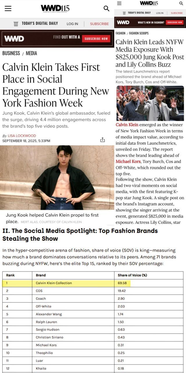 정국이 참석한 9월 13일 하루 동안 X(구 트위터)에서는 130만 개 이상의 게시물이 생성되며, 그는 ‘가장 많이 언급된 뮤지션’으로 기록됐다. 글로벌 PR 분석 플랫폼 온클루시브(Onclusive)의 크리스토프 아셀린은 뉴욕 패션위크 기간 중 브랜드 영향력(SOV) 상위 15개를 분석한 결과, 캘빈클라인 컬렉션이 69.58%로 압도적인 1위를 차지했다고 밝혔다.