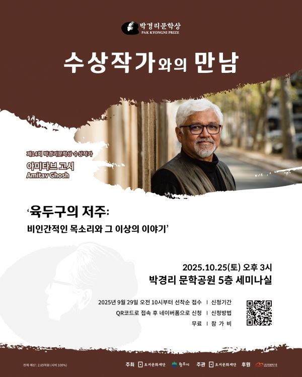 토지문화재단은 “2025년 제14회 박경리문학상 수상자로 인도 출신의 미국 작가인 아미타브 고시 Amitav Ghosh가 수상 작가로 선정되었으며, 이와 관련해 심사위원회에서 아미타브 고시 작가를 선정한 이유를 담은 심사평을 밝힌다”고 말했다.