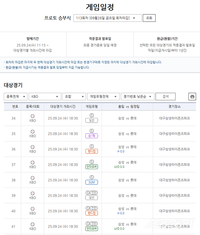전반 일반·핸디캡·언더오버 등 다양한 게임 유형 제공…9월 24일 오후 6시 30분까지 구매 가능