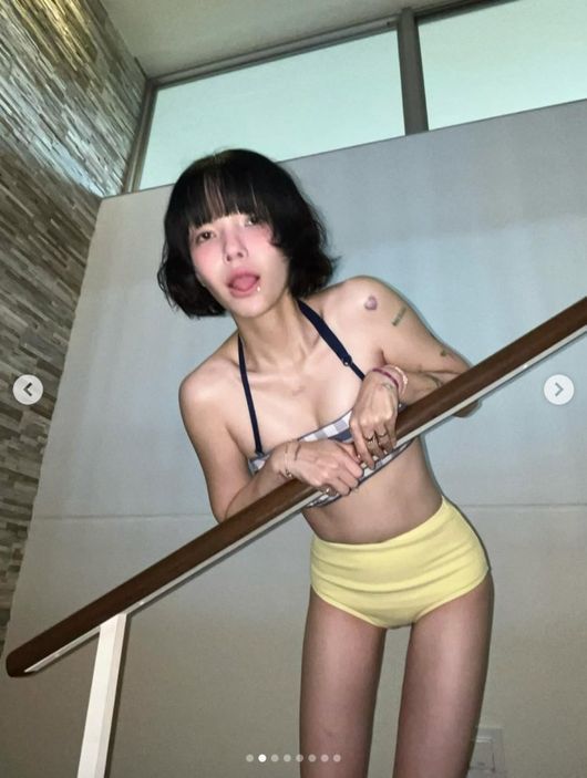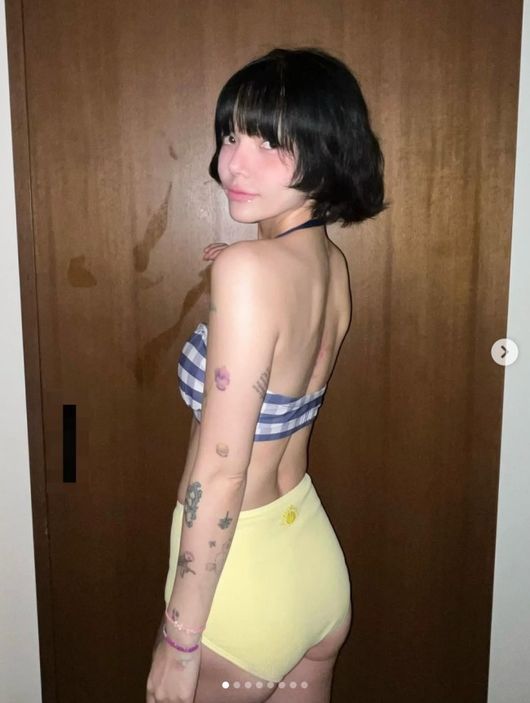 특히, 체크무늬와 노란색 조합의 비키니를 입고 군살 하나 없는 늘씬한 몸매를 뽐내 눈길을 끌었다. 가느다란 팔다리와 잘록한 허리 라인은 걸그룹 시절의 몸매를 연상시키며 감탄을 자아냈다. 또한, 왼팔에 새겨진 여러 문신도 시선을 모았다.