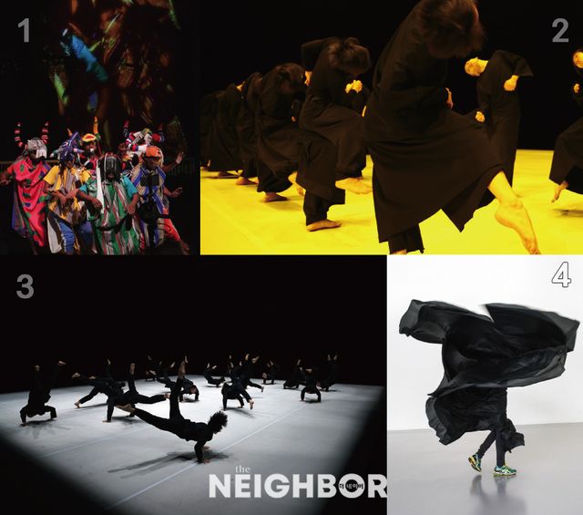 1 즐거운 삶에 대한 갈망을 노래와 춤에 담아냈다. 로빈 올린의 <바퀴를 두른 사람들>. 2, 3 타오 댄스 시어터가 발표한 숫자 시리즈의 두 가지 신작 <16 & 17>. 4 실크를 활용한 독창적인 안무가 특징인 작품 <로이 풀러: 리서치>.