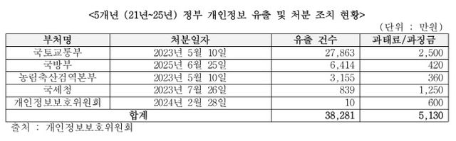 개인정보를 유출한 부처는 국토교통부 2만7863건, 국방부 6414건, 농림축산검역본부 3155건, 국세청 839건, 개인정보보호위원회 10건 순이다. 이들은 개인정보위로부터 5130만원의 과태료 및 과징금 처분을 받았다.