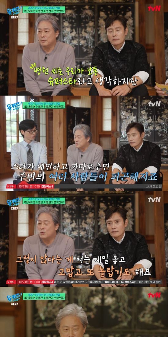 24일 방송된 tvN 예능 프로그램 '유 퀴즈 온 더 블럭'에서는 2000년 영화 '공동경비구역 JSA' 이후 25년 만에 영화 '어쩔 수가 없다'로 다시 뭉친 박찬욱 감독과 배우 이병헌이 출연해 이야기를 나눴다.