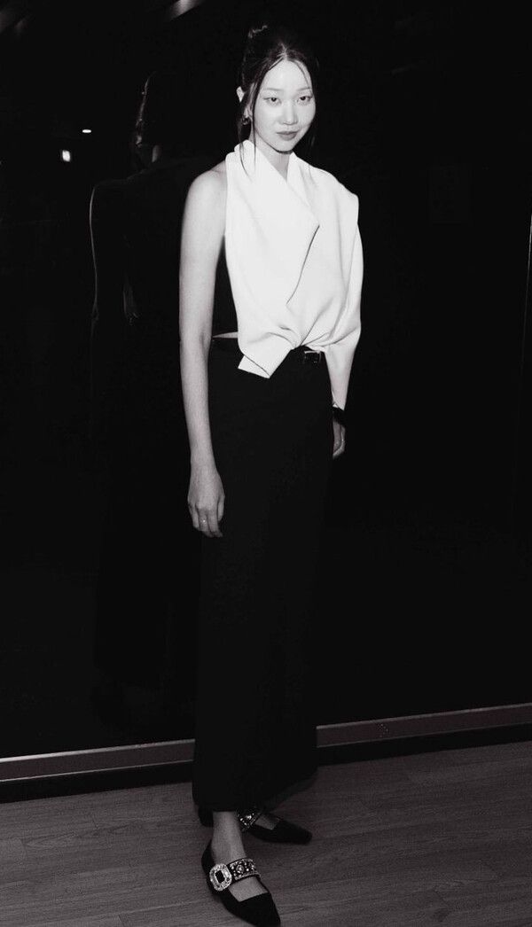 장윤주는 독특한 상의를 소화했다.