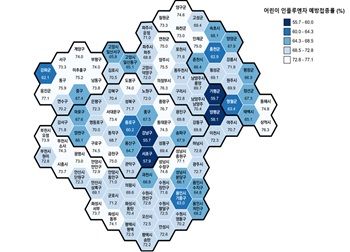 어린이 접종률은 수도권역 시도별 68.772.7%(전국 평균 69.4%)로 나타났으며, 전반적으로 감소 추세를 보이고 있다.