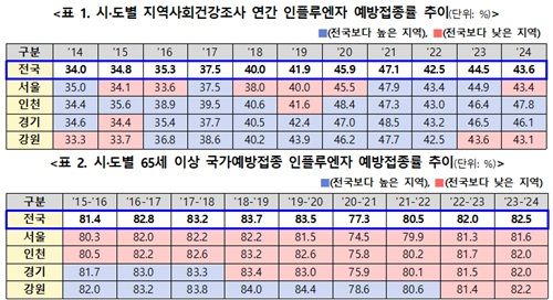 2024년 수도권역 19세 이상 성인의 인플루엔자 예방접종률은 인천 47.8%, 경기 46.1%, 서울 43.4%, 강원 43.1% 순으로 조사됐다.