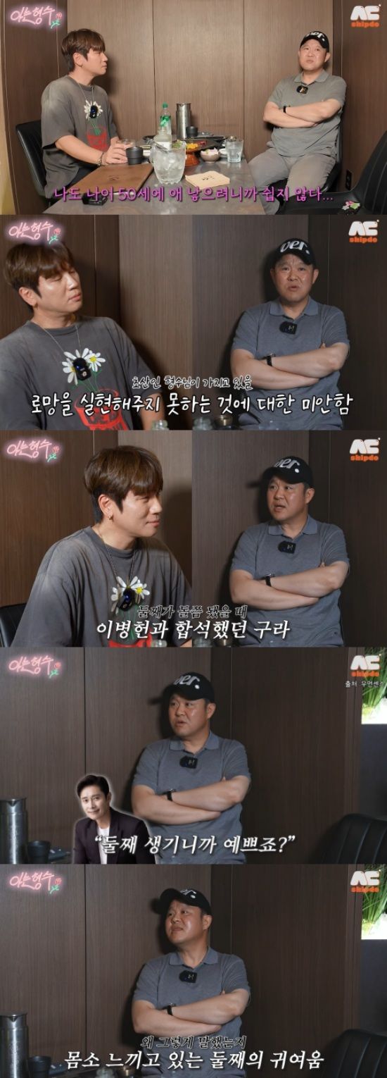 둘째가 돌 됐을 때 배우 이병헌과 합석해서 밥을 먹었다는 김구라는 "그분도 둘째가 생겼다고 하더라. 나한테 '둘째 생기니까 예쁘죠' 묻는데 심드렁하게는 아니지만 그냥 귀엽다고 했다"며 "'그래도 둘째가 주는 즐거움이 있는데 말씀을 건조하게 하냐' 이런 식으로 말하더라. 그냥 귀엽다고 하고 말았다. 지금 생각해 보면 그분이 왜 그렇게 얘기했는지 알겠더라"라고 이야기했다.