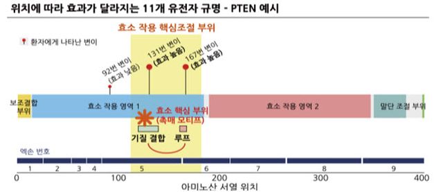 연구 결과, 같은 유전자 변이라도 변이가 발생한 위치에 따라 자폐인의 증상, 혹은 변이 효과가 달라지는 유전자 11개를 확인했다. 예를 들어 ‘PTEN 유전자’는 세포 성장과 신호 조절을 담당하는 유전자인데, 일반 부위에 변이가 생긴 자폐인의 사회성 장애 점수보다 핵심 기능 부위(촉매 모티프 영역, 효소가 실제로 화학반응을 일으키는 중요한 부분)에 변이가 생긴 자폐인은 사회성 장애 점수가 두 배 가까이 높게 나타났다.