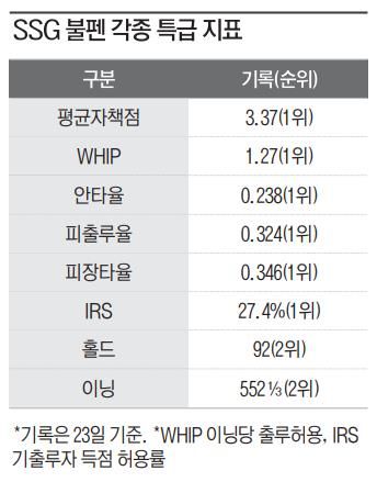 올 시즌 SSG 랜더스 불펜의 위력은 '역대급'이다. 평균자책점, 이닝당 출루허용(WHIP), 피안타율, 기출루자 득점 허용률(IRS)을 비롯한 각종 불펜 세부 지표가 KBO리그 1위.