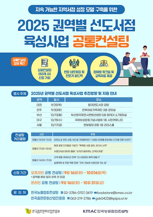 한국출판문화산업진흥원(이하 출판진흥원)은 지역서점의 경쟁력 강화와 지속 가능한 성장을 지원하기 위해 ‘2025년 권역별 선도서점 육성 사업’의 단계별 컨설팅 참여 서점을 모집한다.