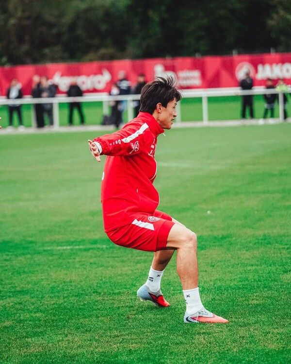 사진에서 이재성은 마인츠의 붉은색 훈련복과 태극기가 새겨진 흰색 양말을 신고 훈련에 임했다.