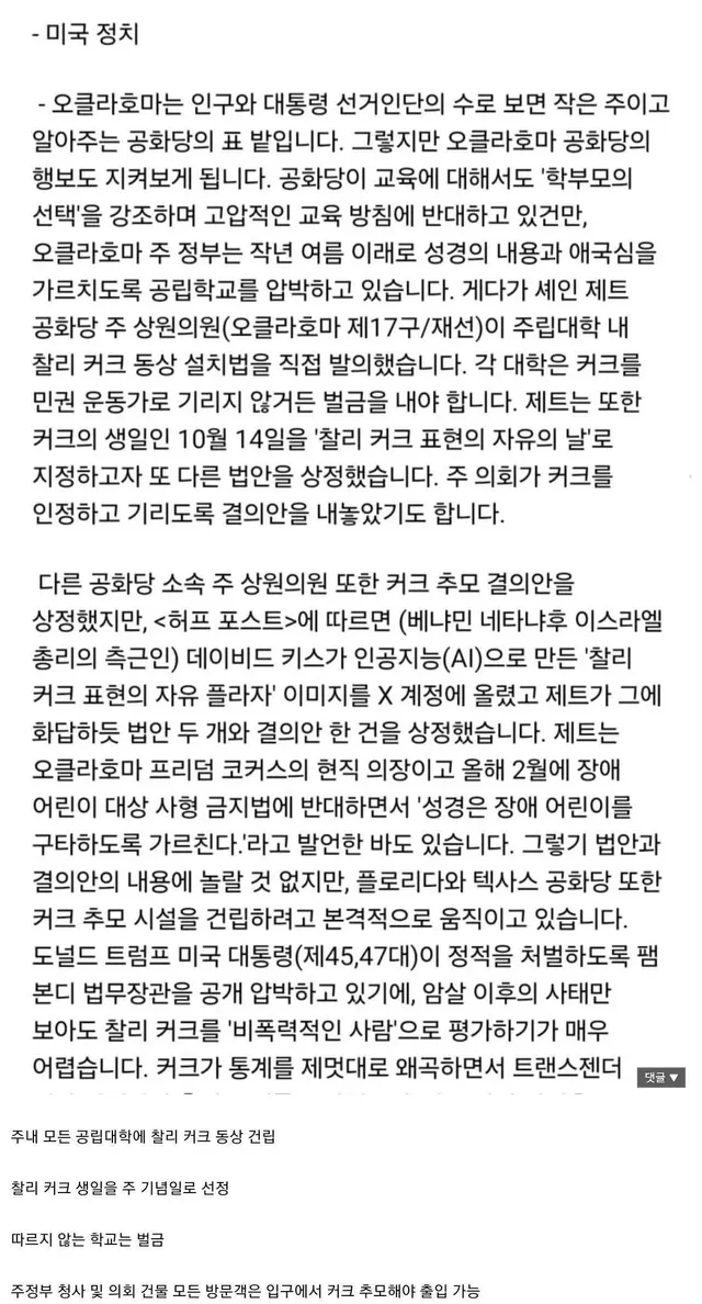 미국 오클라호마 주에서 벌어지고 있는 찰리 커크 우상화