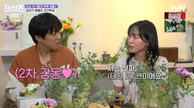 차태현은 꽃꽂이를 하던 중 선생님에게 “핸썸즈 보신 적 있냐?”라고 물었다. 선생님은 “네 유튜브 클립으로 많이 봤다”라고 답했다. 이에 차태현은 “유심히 봤던 멤버가 있냐?”라고 물었다. 그러자 선생님은 “저는 차태현 씨다. 항상 솔직하신 거 같아서 좋았다”라고 고백했다.
