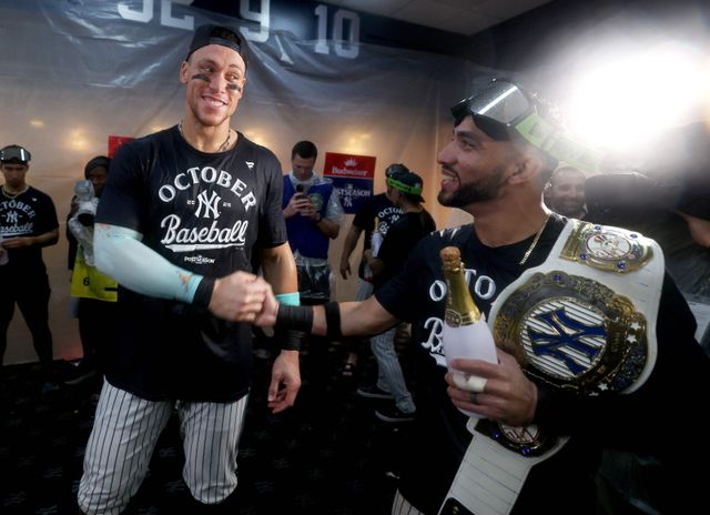 NEW YORK, NEW YORK - SEPTEMBER 23: Aaron Judge #99 of the New York Yankees celebrates with Jos? Caballero #72 in the locker room after the New York Yankees clinched a playoff spot against the Chicago White Sox after their game at Yankee Stadium on September 23, 2025 in New York City. Al Bello/Getty Images/AFP (Photo by AL BELLO / GETTY IMAGES NORTH AMERICA / Getty Images via AFP)/2025-09-24 12:10:41/