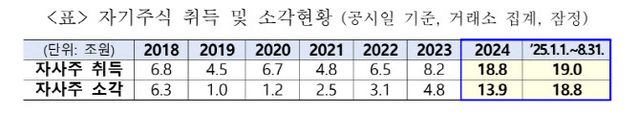 정부는 앞서 지난해 기업가치 제고계획 공시와 함께 자본시장법 시행령 등 개정을 통해 상장법인이 자기주식을 발행주식총수의 5% 이상 보유하는 경우에는 자기주식 보유현황·향후 처리계획 등을 공시하도록 의무화했다. 이에 작년부터 자기주식 취득·소각 규모가 급증하고 있으며, 올해도 8월까지 소각규모(18조8000억원)가 작년 전체 소각규모(13조9000억원)를 넘어서는 등 자기주식 취득 및 소각규모 증가추세가 지속되고 있다.