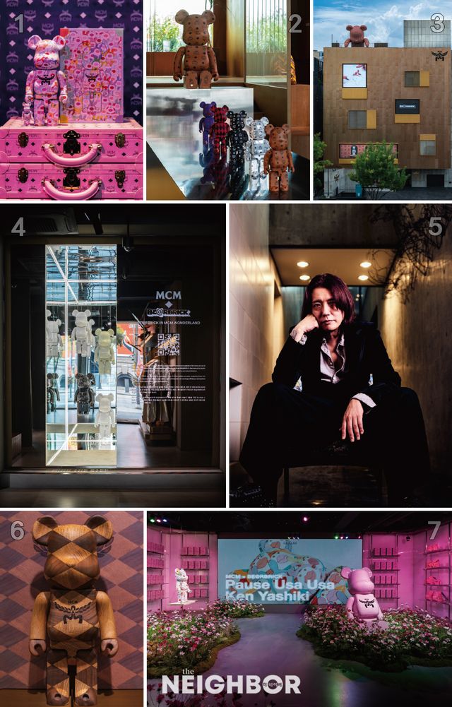 1 켄 야시키 특유의 대담하고 강렬한 패턴을 재해석한 비주얼의 BE@RBRICK. 2 맨 앞부터 2021년, 2023년, 2024년에 선보인 3개의 협업 시리즈. 뒤의 2개는 2025년 협업 시리즈로, 팝 컬처와 하이패션의 결합 그리고 ‘조커(The Joker)’와 협업한 BE@RBRICK이다. 3 <BE@RBRICK in MCM Wonderland> 전시가 열린 MCM 하우스(MCM HAUS). 4 현실과 환상이 교차하는 MCM 미러룸. 5 전시 큐레이션을 진행한 메디콤 토이의 CEO 타츠히코 아카시 (Akashi Tatsuhiko). 6 이번 전시를 위한 3개의 MCM 익스클루시브 BE@RBRICK 컬렉션 중 하나인 가리모쿠 400%. 7 켄 야시키와 협업한 전시 공간.