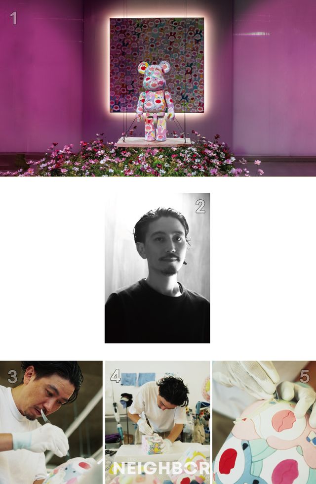 1 켄 야시키의 ‘PAUSE-Usa Usa’와 이 작품을 재해석한 패턴을 넣어 제작한 BE@RBRICK. 2 켄 야시키. 3, 4, 5 켄 야시키가 키메코미 기법으로 작업하는 모습.