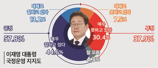 이재명 대통령 국정 운영 평가 '긍정' 57.8% '부정'37.9%...20대 '긍정' 41.8% '부정' 53.0%