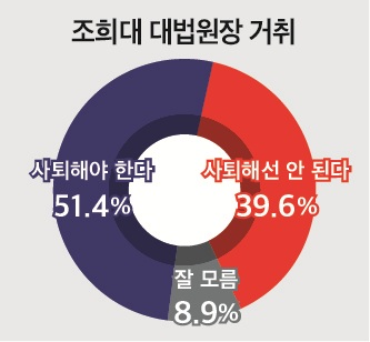조 대법원장의 사퇴 여부'를 묻는 질문에 '사퇴해야 한다'는 의견이 전체 응답자의 51.4%, '사퇴해선 안 된다'라는 의견이 39.6%로 집계됐다. '잘 모름'은 8.9%였다.