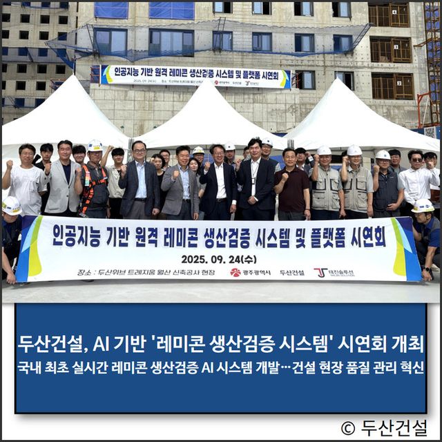 두산건설(011160)이 지난 24일 광주광역시 '두산위브트레지움 월산' 현장에서 건설 품질 신뢰도 향상을 위해개발한 AI 기반 '레미콘 생산검증 시스템' 시연회를 개최했다.
