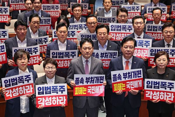 최은석 원내수석대변인은 "민주당이 본회의에서 밀어붙이는 정부조직법 개정안은 국가의 근간을 뒤흔드는 폭거"라며 "법치와 재정을 권력의 도구로 삼는 순간 민주주의는 파국을 향하게 된다"고 했다.