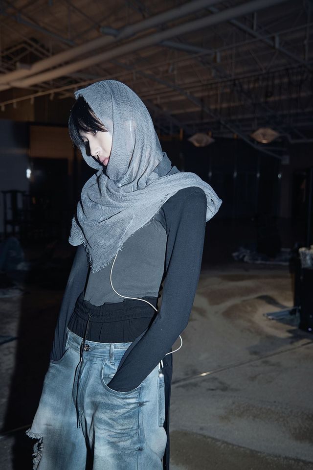 권봉석 고립은 장식을 덜어내며 단순화한 옷의 형태로, 마치 방 안에 홀로 있는 듯 고요한 상태를 시각적으로 표현했어요. 반면 구조적 절개와 주름 디테일, 원단을 겹친 디자인으로 울림을 구현했죠. 작은 움직임에서 공간감이 생기고, 보는 각도에 따라 다르게 보이도록 말예요. 그러데이션 워싱과 염색 기법, 다양한 텍스처로 시각적 파동 또한 더했죠.
