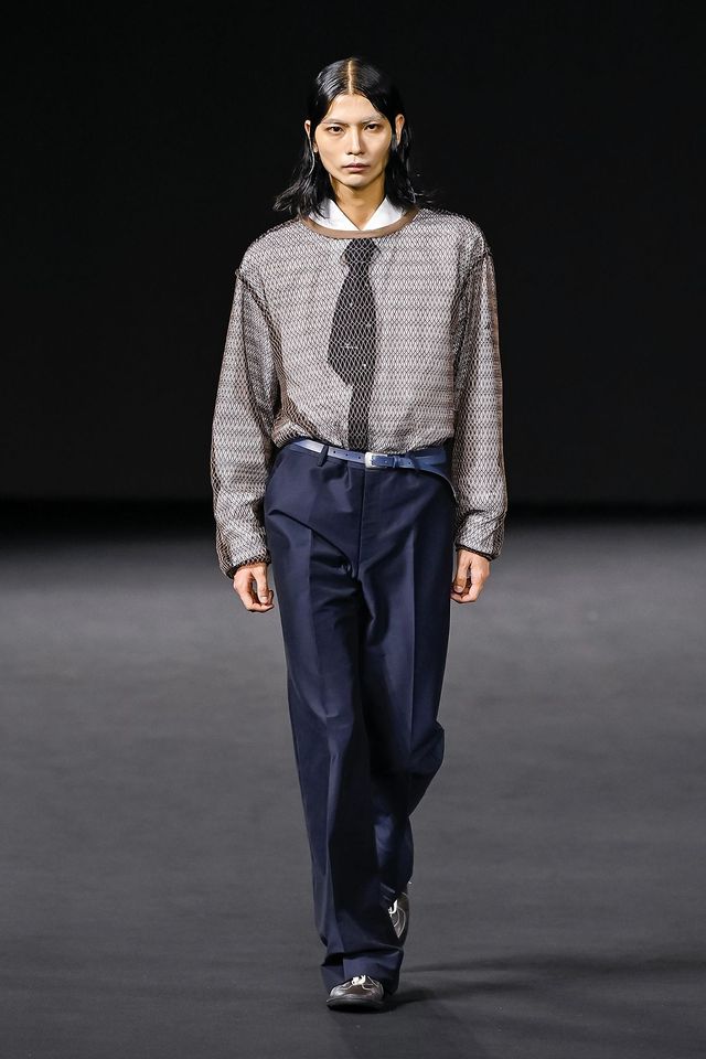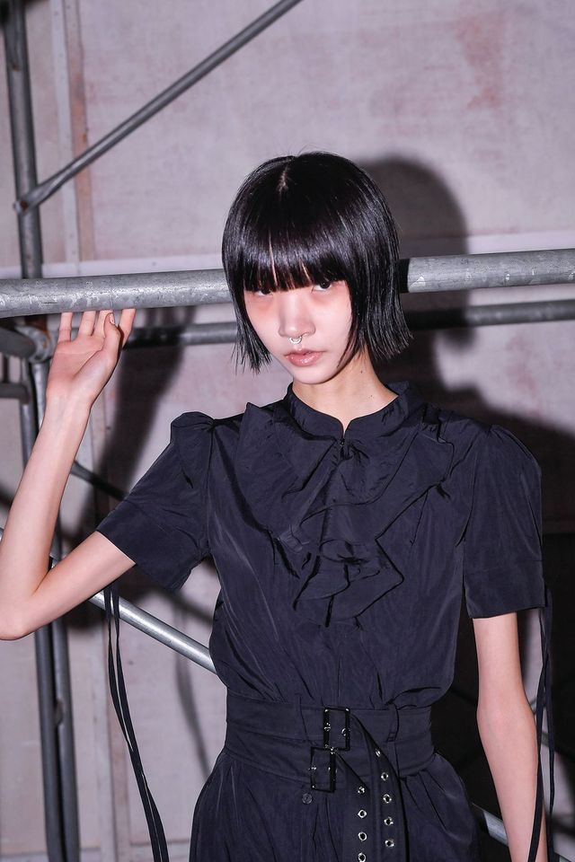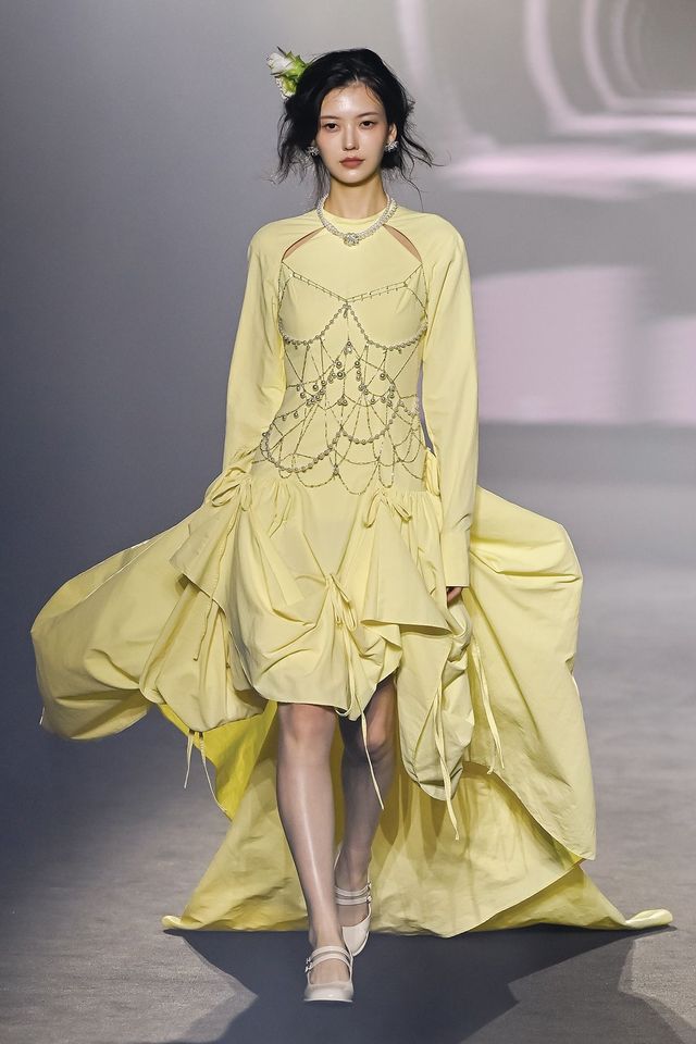 고민우 영화 〈무드 인디고〉에서 영감을 받아 ‘She was a color’라는 슬로건 아래 전개했어요. 사랑, 시간 등 사라지는 것들을 색의 빠짐으로 표현했고, 찬란하고 아름다운 순간들이 공허로 이어지는 서사를 담았어요. 이에 런웨이 초반은 파스텔 컬러와 레이스 장식으로 행복감을 구현했고, 후반으로 갈수록 모노톤 컬러와 해체적 디자인, 다크서클 메이크업으로 변주하며 부정성을 확장했어요.