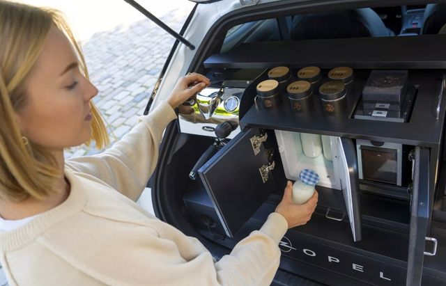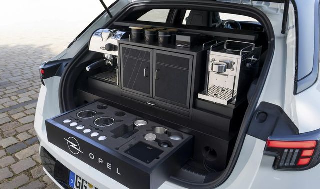 외관은 일반 모델과 크게 다르지 않지만, 트렁크를 열면 전혀 다른 공간이 펼쳐진다. 원두용과 캡슐용 커피 머신이 각각 설치돼 있고, 전동 그라인더와 우유 스티머, 소형 냉장고까지 갖췄다. 모든 장비는 오펠 로고가 새겨진 전용 수납장에 깔끔하게 들어가 있다. 대신 적재 공간은 사실상 사라졌다. 인포테인먼트 화면에도 커피 아이콘이 추가됐다.